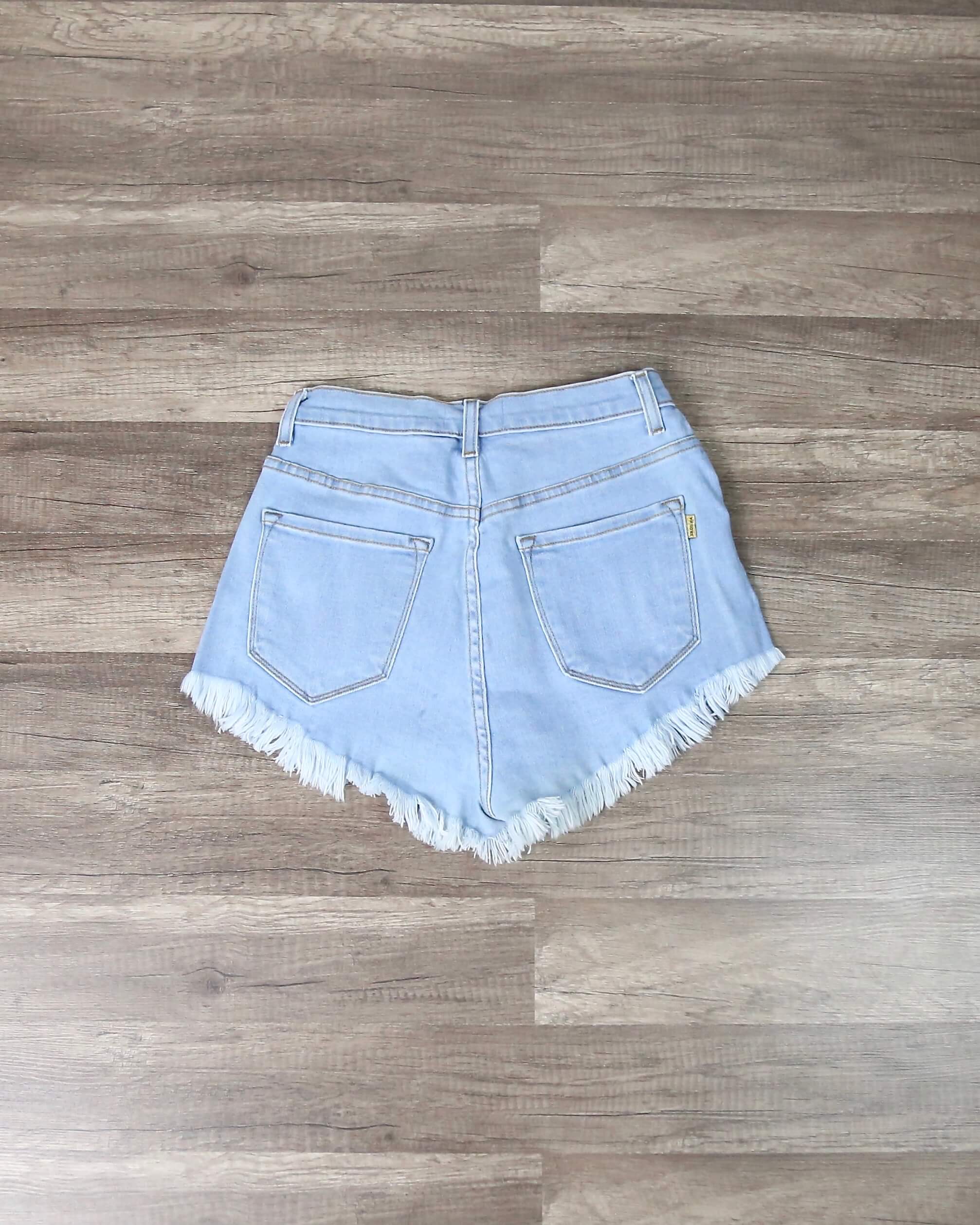 High Waisted Distressed Denim Shorts in Light Wash quantity