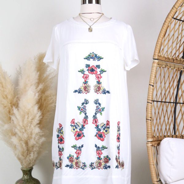 Ultra-soft navy dress featuring a swinging trapeze silhouette with a tiered design and an acid-wash finish for that effortless vintage inspired vibe. Button-up front, adjustable shoulder straps, and white scalloped lace at the hemline. Unlined, opaque.