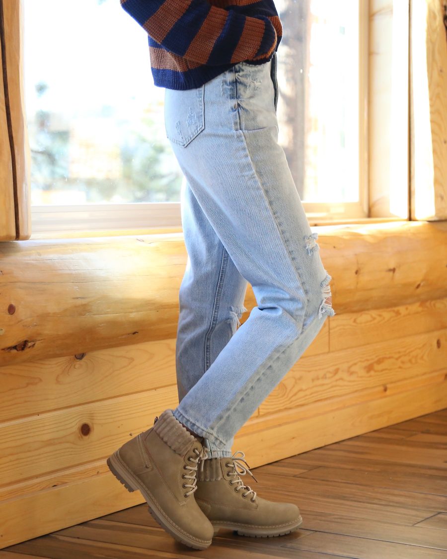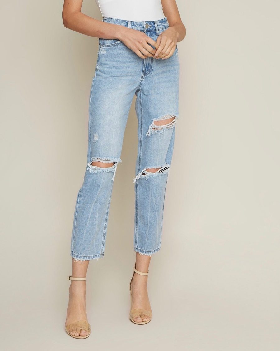 Everyone loves a good pair of mom jeans! These feature multiple areas of distressing, straight leg, and are high waisted. Pair these jeans with a bodysuit and some heels for a classy look!