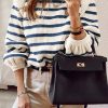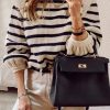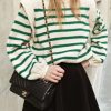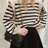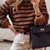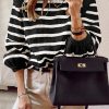 Long Lantern Sleeve Striped Ribbed Knit Pullover Top quantity